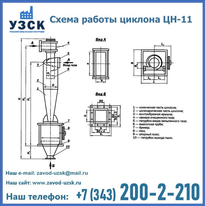 При этом ощутимой разницы в цене между универсальным и узконаправленным, подобранным в соответствии с конкретными техническими требованиями циклоном, нет. Стоимость воздухоочистительного оборудования типа циклон обусловлена маркой и толщиной стали, из которого он изготовлен, сложностью и специфичностью конструкции, наличием дополнительного оснащения (бункер, улитка и другие). При необходимости, на заводе УЗСК в Новомосковске будет изготовлен циклон по индивидуальным техническим чертежам заказчика.